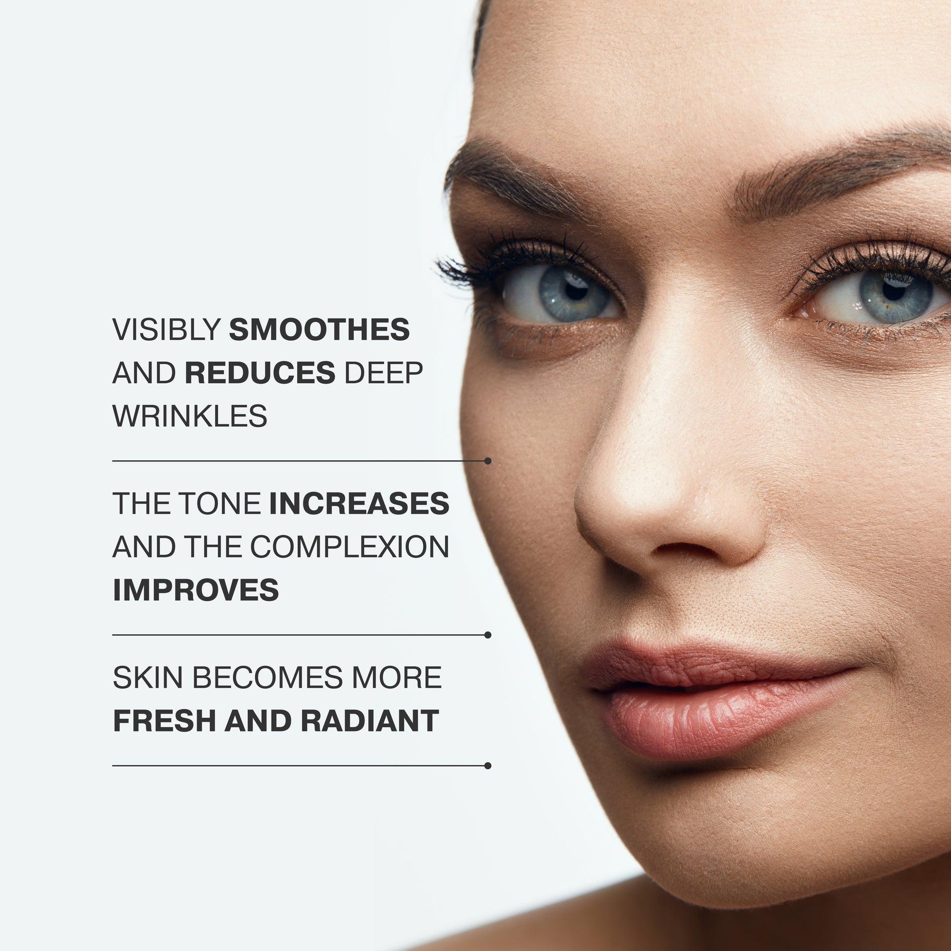 يحتوي المصل على مركب نشط له تأثير شد فوري وطويل الأمد ويمنع تكوين التجاعيد. ينعم ويقلل التجاعيد العميقة (على الجبهة، التجاعيد بين البني، أقدام الغراب، طيات الأنف الشفوية، التجاعيد على الخدين وزوايا الفم) بشكل واضح. يرطب البشرة بعمق وطويل الأمد.