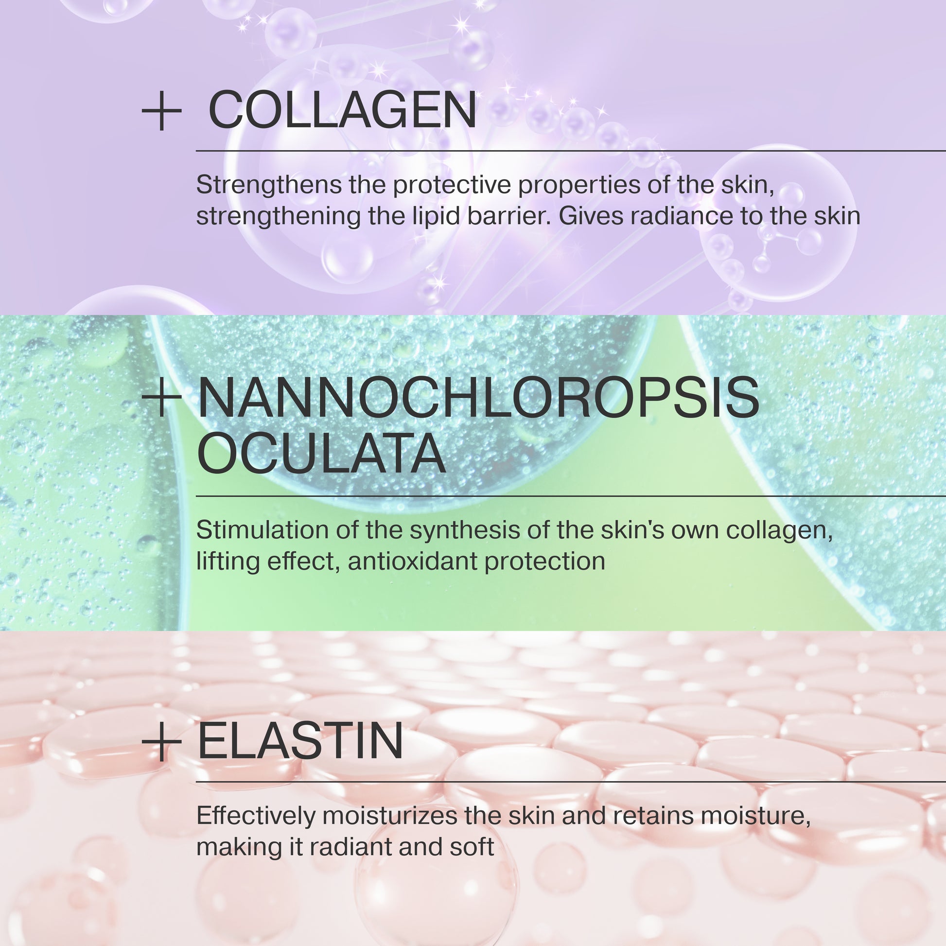 يعمل مصل الكولاجين على شد البشرة وتوحيد لونها على الفور، ومع الاستخدام المنتظم، يعيد تحديد شكل الوجه البيضاوي ويزيل التجاعيد. يومًا بعد يوم، تمتلئ بشرتك بالطاقة والحيوية: تصبح أكثر كثافة ومرونة وثباتًا ونعومة وخالية من التجاعيد ونضرة ومشرقة!
