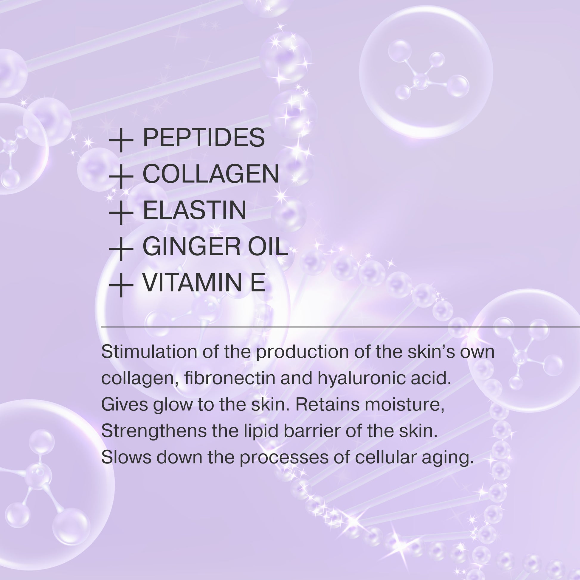 Активные ингредиенты коллаген-эластинового комплекса и активные пептиды, входящие в состав средства, замедляют процесс разрушения коллагеновых волокон, стимулируют выработку собственного коллагена и эластина, удерживая влагу, укрепляют липидный барьер, замедляя процессы клеточного старения кожи. Уменьшается выраженность и глубина морщин, повышается тонус и улучшается цвет лица, исчезают следы усталости.