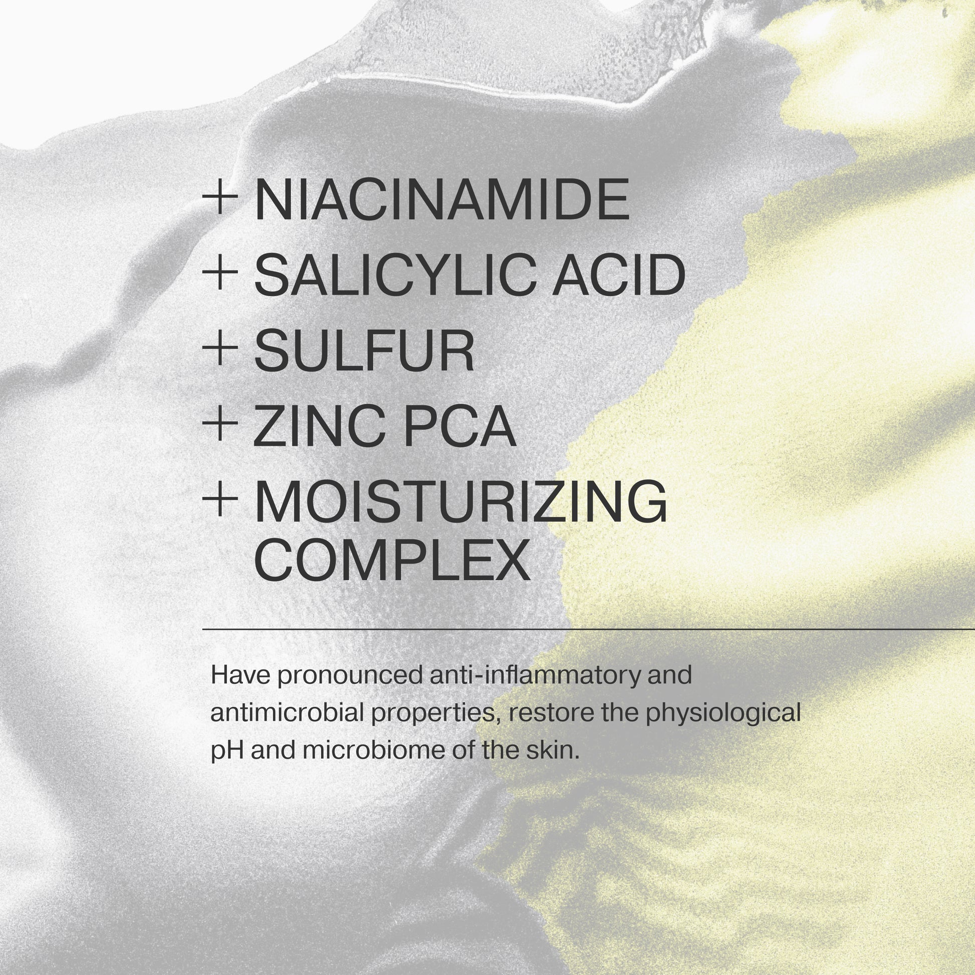 AQUA, PROPYLHEPTYL CAPRYLATE, BORON NITRIDE, GLYCERIN, CAPRYLYL METHICONE, NIACINAMIDE, PPG-15 STEARYL ETHER, POLYMETHYLSILSESQUIOXANE, HYDROXYETHYL ACRYLATE/SODIUM ACRYLOYLDIMETHYL TAURATE COPOLYMER, GLYCERYL STEARATE, PEG-100 STEARATE, HEXYLENE GLYCOL, XYLITYLGLUCOSIDE, SALICYLIC ACID, ANHYDROXYLITOL, SULFUR, ISOHEXADECANE, ZINC PCA, CETEARYL ALCOHOL, CAPRYLOYL GLYCINE, POLYSORBATE 60, INULIN, C30-45 ALKYL CETEARYL DIMETHICONE CROSSPOLYMER, XYLITOL, OLUS OIL, CAPRYLYL GLYCOL, METHYLPROPANEDIOL, DIDECYLDIMONIUM CHLORIDE, POLYQUATERNIUM-80, POLYACRYLATE CROSSPOLYMER-6, DISODIUM CETEARYL SULFOSUCCINATE, ALPHA-GLUCAN OLIGOSACCHARIDE, PEG-30 CASTOR OIL , CHLORPHENESIN, SODIUM HYDROXIDE, DISODIUM EDTA.