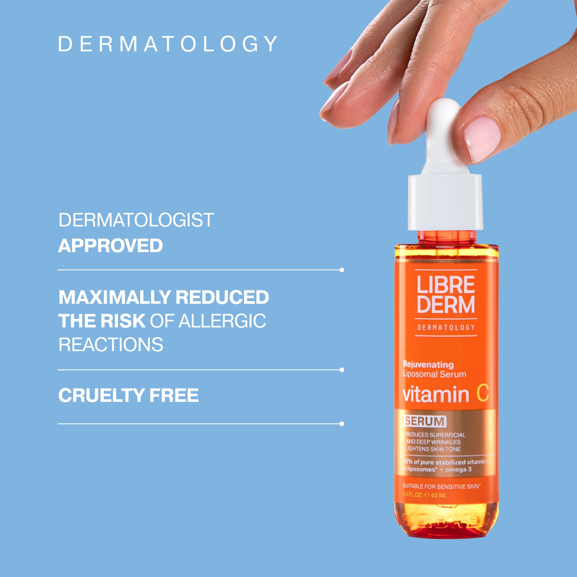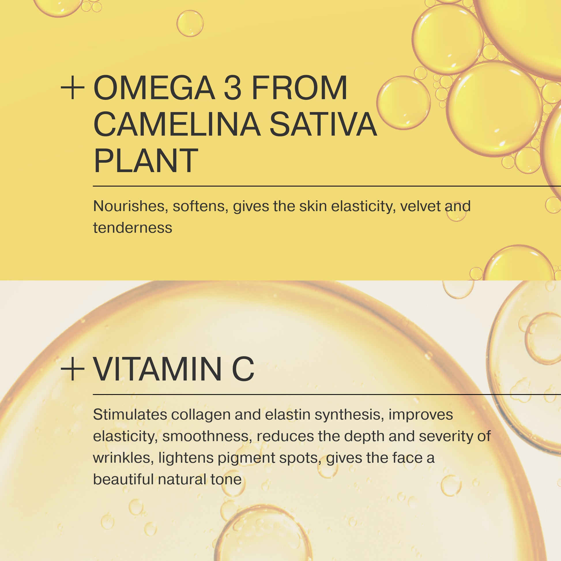 В состав липосомальной омолаживающей сыворотки "Vitamin C" входит инновационная стабилизированная форма витамина С в высокой концентрации- стимулирует синтез коллагена и эластина, улучшает упругость, гладкость, уменьшает глубину и выраженность морщин, осветляет пигментные пятна, придает лицу красивый естественный тон. Омега 3 из натурального масла рыжика питает, смягчает, придает коже эластичность, бархатистость и нежность. Сыворотка подходит для всех возрастов и типов кожи- максимально снижен риск возникновения аллергических реакций.