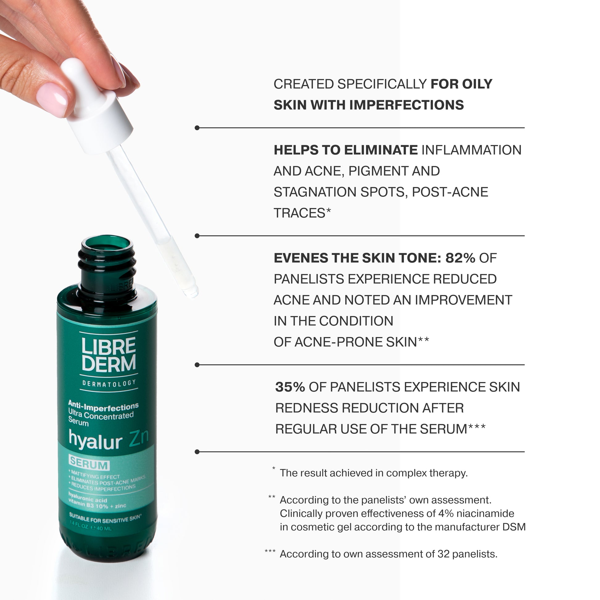 В состав ультраконцентрированной сыворотки для кожи с несовершенствами "Hyalur Zn" входит ниацинамид (Витамин В3) 10% - осветляет и выравнивает поверхность кожи, способствует уменьшению гиперпигментации, уменьшает поры. Цинк (Zinc PCA) регулирует работу сальных желез, подавляет рост патогенных бактерий. Гидролизованные молочные протеины нормализуют выработку кожного сала. Метилсульфонилметан (dimethyl sulfone) борется с гиперпигментацией и осветляет кожу. Помогает справится с постакне. Низкомолекулярная гиалуроновая кислота удерживает влагу в коже, стимулирует выработку собственной гиалуроновой кислоты. Сыворотка разрешена к применению для проблемной кожи у всех возрастов. Подходит для всех типов кожи.