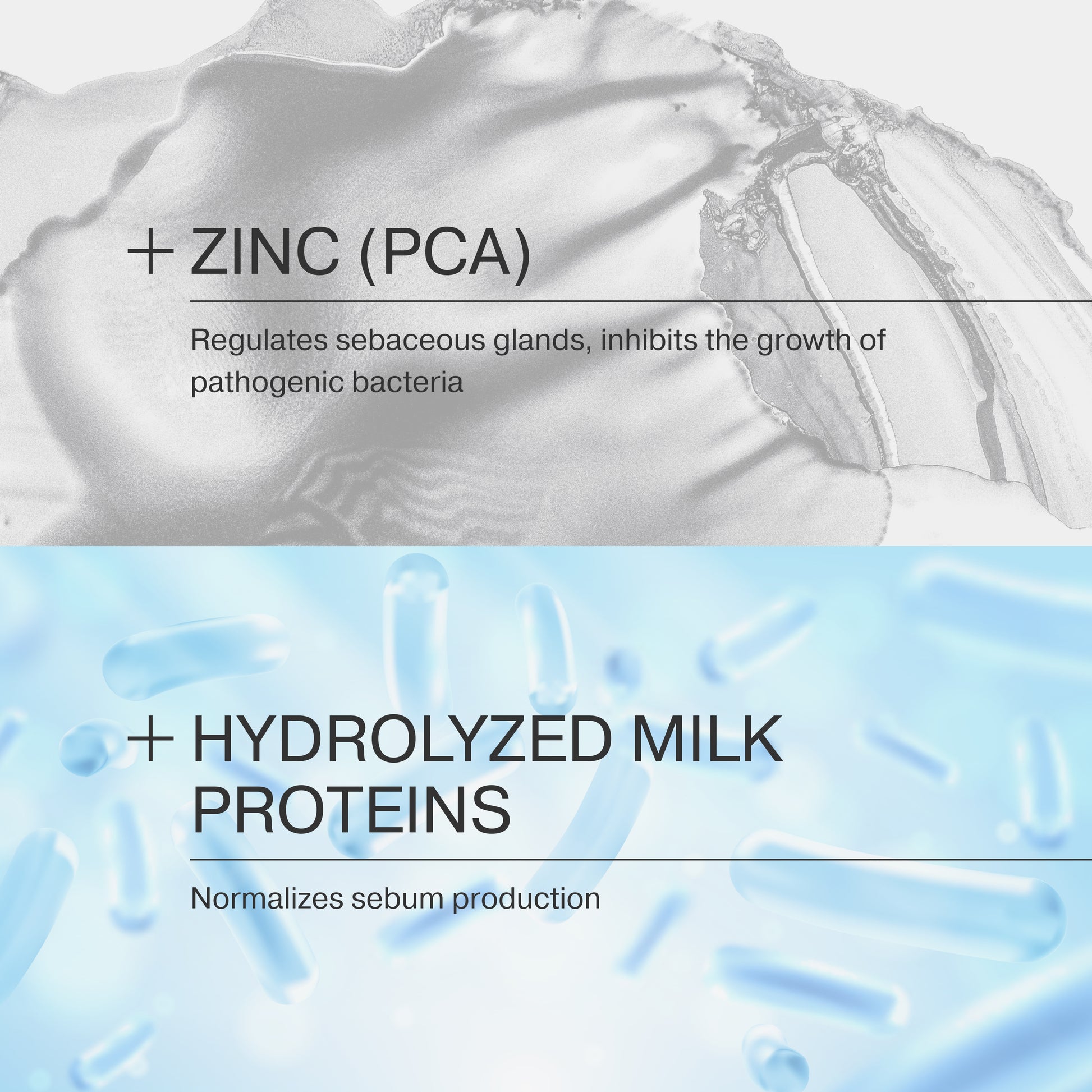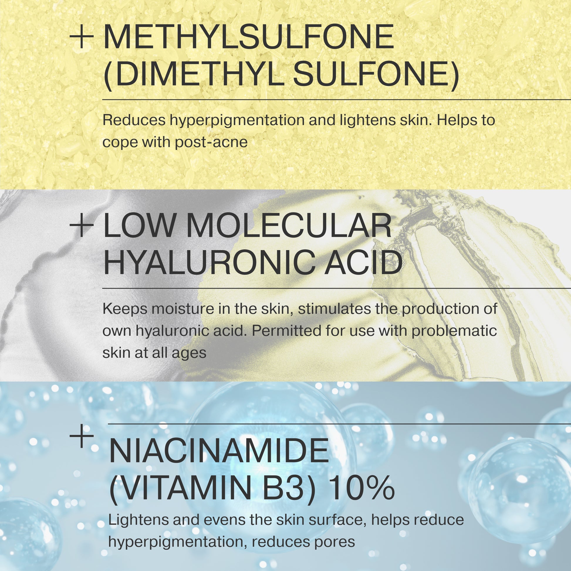 AQUA, NIACINAMIDE, DIMETHYL SULFONE, PROPYLHEPTYL CAPRYLATE, ZINC PCA, HYDROLYZED MILK PROTEIN, GLYCERIN, BENZYL ALCOHOL, SALICYLIC ACID, SORBIC ACID, HYDROXYETHYL ACRYLATE/SODIUM ACRYLOYLDIMETHYL TAURATE COPOLYMER, XANTHAN GUM, LECITHIN, SCLEROTIUM GUM, PULLULAN, UNDECANE, TRIDECANE, SODIUM HYALURONATE, CHLORPHENESIN, DISODIUM EDTA.